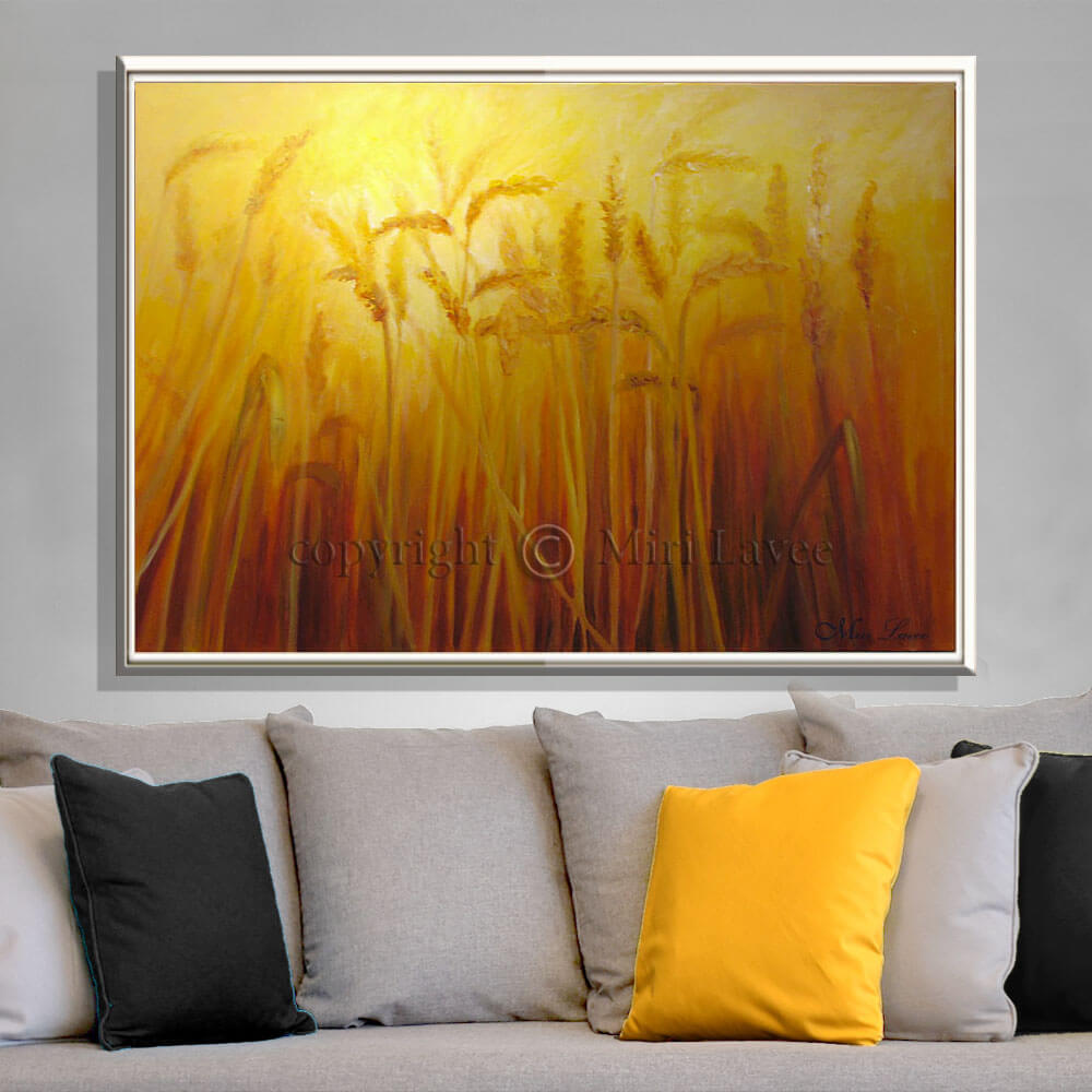ציור שיבולים באור קסום בשדה תמונה גדולה בסלון ציירת מירי לביאהי, לקראת שבועות אספר לך על הזמנה לא שגרתית, דרך ניגודים תמוהים… ועד לתובנה על חיבור ושייכות..