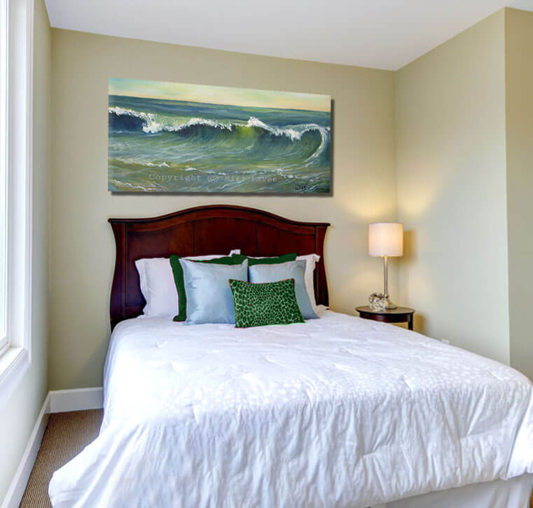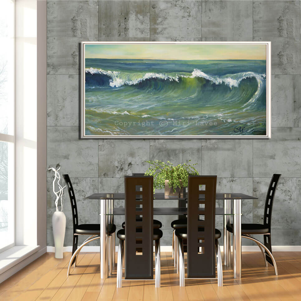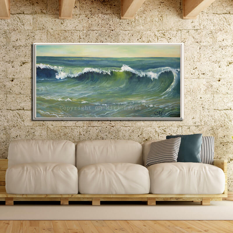 ציור ים ציור שמן גדול שמניע את זרימת האנרגיה החיובית בחדר וממלא שמחה בלב, שמן על קנבס, גודל 150X75 ס”מ. ציירת מירי לביא.